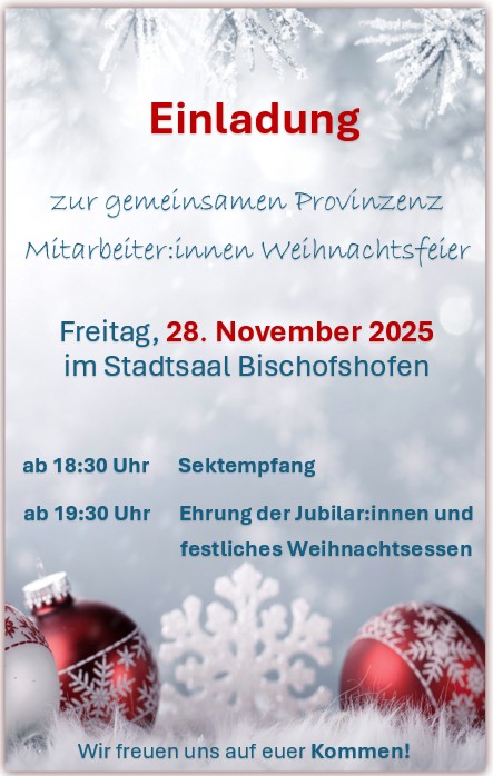 Die Geschäftsführung und der Betriebsrat lädt alle Mitarbeiter:innen herzlich zur gemeinsamen Provinzenz Mitarbeiter:innen Weihnachtsfeier am 28.11.2025 ein🎄